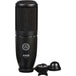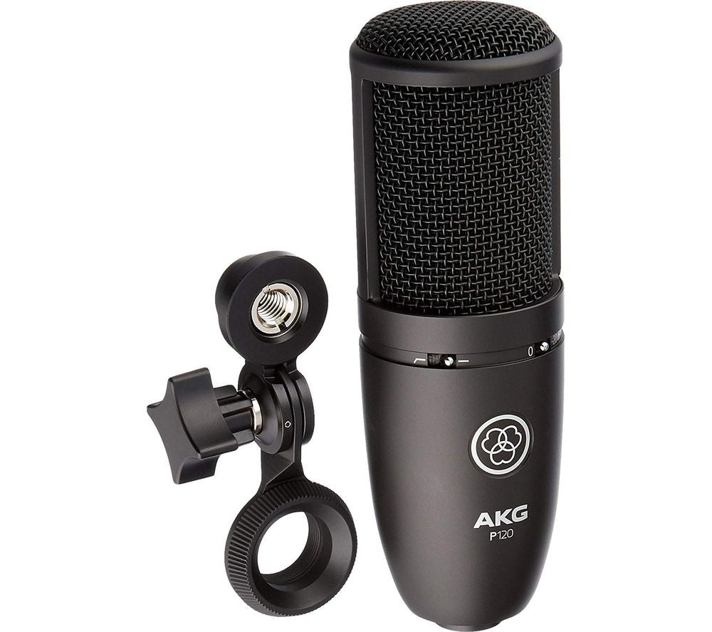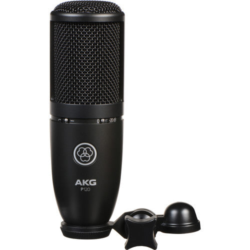 The black P120 from AKG is a side-address condenser microphone with a cardioid pattern designed to capture vocals, acoustic guitars, percussion, and amplified instruments in project studios, home recordings and live situations. The low-mass 0.66“ gold-sputtered diaphragm delivers a clear sound with accurate details, and it is capable of handling sound-pressure levels up to 150 dB without introducing perceptible distortion. A switchable low-cut filter at 300 Hz helps reduce rumble or wind noise, and a switchable 20 dB pad enables distortion-free recording of very loud sound sources associated with proximity miking. The all-metal body improves rejection of RF interference so you can use the microphone near transmitter stations and along with wireless microphones. The P120 is built to resist high temperatures and humidity. The rugged body and sturdy front grille protect it from tough handling.